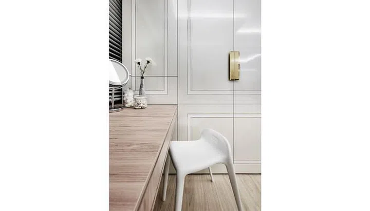 The walk-in wardrobe was designed to reflect Eileen’s preference for light colours, while brass inlays in the wardrobe doors and brass-finished handles add a touch of luxury. The doors also have the same rectangular frame motif as the living room and kitchen carpentry.