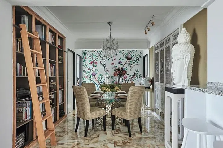 She continues, “I am half-Peranakan, and have always been drawn to loud colours and the Oriental style, with a French twist. Trifven knows my style well, and went to Goodrich Global to pick out several prints with butterflies, birds and flowers like peonies. We retained the marble and terrazzo floors from the original unit. Many of our furniture pieces, such as the dining chairs, are from Taylor B.”