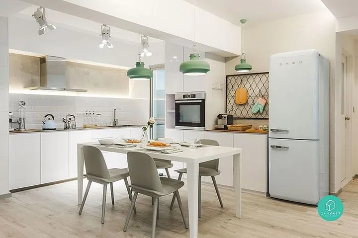 This bright, airy home in Joo Seng features an open-concept kitchen and dining space. By keeping the palette light with pops of pastel colours, the home looks more spacious and inviting.