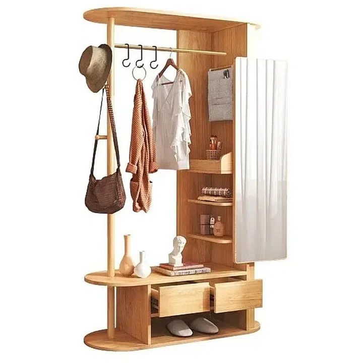 It is a chic all-in-one vanity dresser setup that seamlessly integrates a swing-out mirror, inner shelvings that are perfect for beauty products, 2 spacious bottom drawers to stow away any hot hair tools and accessories, as well as the clothing rail and knobs at the side for your bags and hats too! You can choose from the different wood tones of ashwood, walnut, and ebony to jazz up any vanity or entryway.