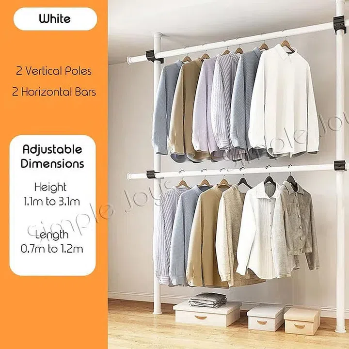 The two-tiered setup can hold up to 90 kg worth of clothes on both levels when they are not extended at a regular 1 metre wardrobe width. You can add on and expand the wardrobe structure by purchasing another set.