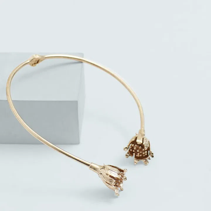 Beautifully embellished with two floral motifs at the ends, this choker has an an abundance of contemporary appeal. Wear it with all-black outfits for an eye-catching embellishment.