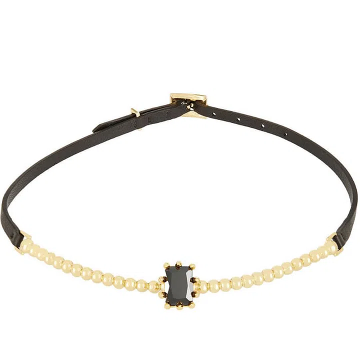 This gold-plated brass style choker sports a glossy black crystal on the front and fastens with a buckle on a leather band at the back. Perfect for the elegant yet rebellious girl.