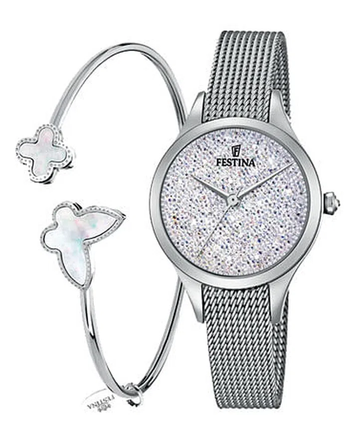 The Festina Mademoiselle collection includes women’s timepieces that you can’t go wrong with as gifts. Among them is this beautiful model ($229) with a stainless steel case and mesh bracelet, and Swarovski crystals that shine and sparkle on the dial. As a bonus, with every purchase, you’ll receive a complimentary bangle finished with a light grey mother-of-pearl inlay, while stock lasts.