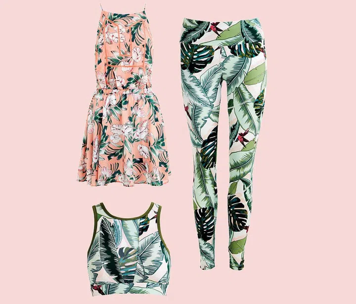 Sandy getaways call for bright and sunny beachwear from Australian brand Seafolly. The Palm Beach print evokes a coastal jungle, mixing moss-green palm trees, pale pinks, and pops of fuchsia hummingbirds. Wear the cropped top ($99.95) and the leggings ($109.95) under the Tropicana dress ($169.95), a feminine and versatile piece that will take you easily from pool to party.