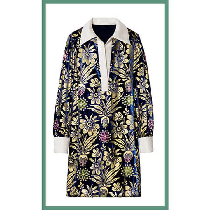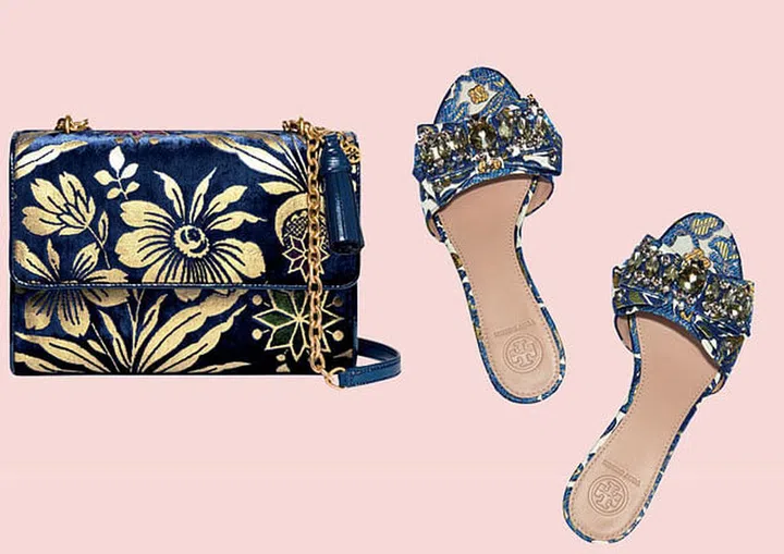 Take outfit inspiration from the breezy and effortless style of Tory Burch’s holiday collection. The Thelma dress ($995) in metallic velvet with contrasting gazar cuffs pairs perfectly with the Valentina Bow Slide ($700), low-heeled sandals in a floral brocade pattern with eye-catching crystals. The Cosmic Floral shoulder bag ($885) is an embroidered velvet creation with removable tassels and adjustable shoulder strap.