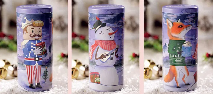 Filled with delicious chocolate, the limited-edition Dark Chocolate CaramelCrisp popcorn from Garrett is a delectable treat. The three stackable tins feature three whimsical characters inspired by the holiday season – a snowman, a red fox and a gallant nutcracker soldier – against a snowy backdrop.