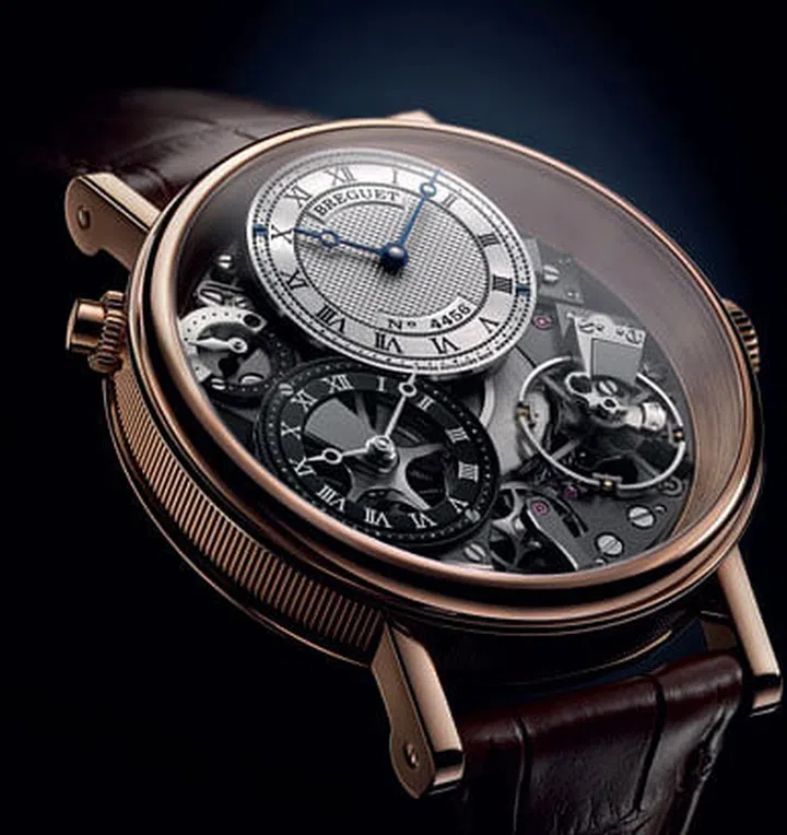 The Breguet Tradition GMT wristwatch in 18K rose gold, with a hand-wound movement, is fit for any occasion. Its black, off-centre sub-dial displays a second time zone, and is hand-engraved on a rose engine. This is a timepiece that will appeal to anyone.