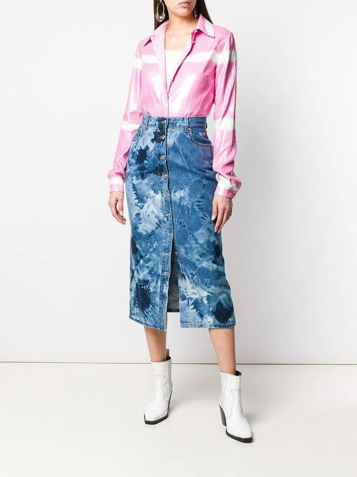 Another piece that shows tie-dye can be uber fashionable is this denim number from MSGM. Crafted from cotton denim, this skirt elevates the boring denim skirt with a youthful and dynamic print. Not just that, it has a high waist with a straight fit, and button fastening all the way down the front. It would look fab with white sneakers and a white crop tee, complete with your favourite shades.