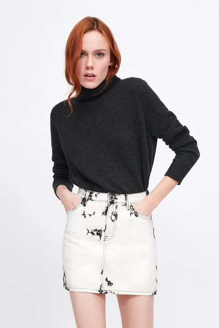 Isn’t this number cute? The base is an off-white hue, with black dye print splattered sporadically all over the piece. Bonus: The print on each skirt is unique. This skirt would work well if you dress it up with a blazer and blouse, or opt for a punkier vibe with a logo band tee and sneakers.
