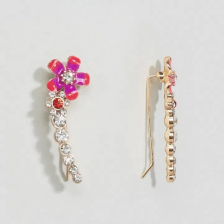 Ear climbers are sure to attract attention – but they're not too in-your-face. I think this pair is quirky with the dual-coloured flower and red rhinestone. Photo: ASOS