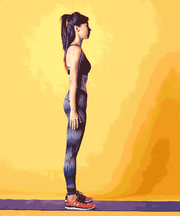 Stand with feet hip-width apart. As if sitting on a chair, lower body as far as possible, keeping back straight and tailbone tucked. Knees should point straight and not go beyond toes.