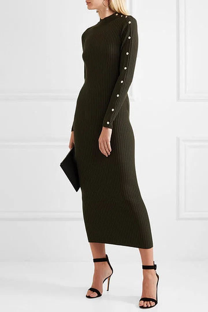 Versace Button-embellished ribbed wool-blend midi dress, $958 from Net-a-porter.com.