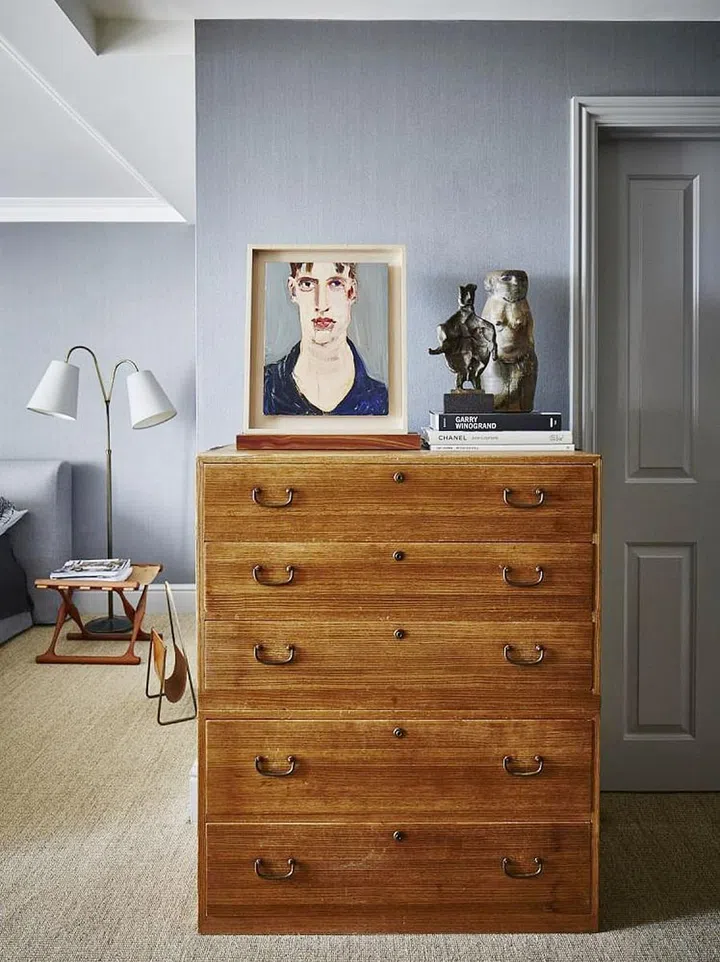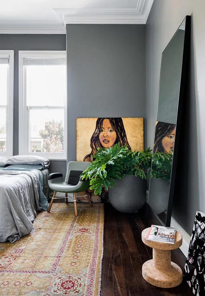 A jumble of shapes and sizes, like oversized mirrors and pots, keep the proportions in the room interesting.