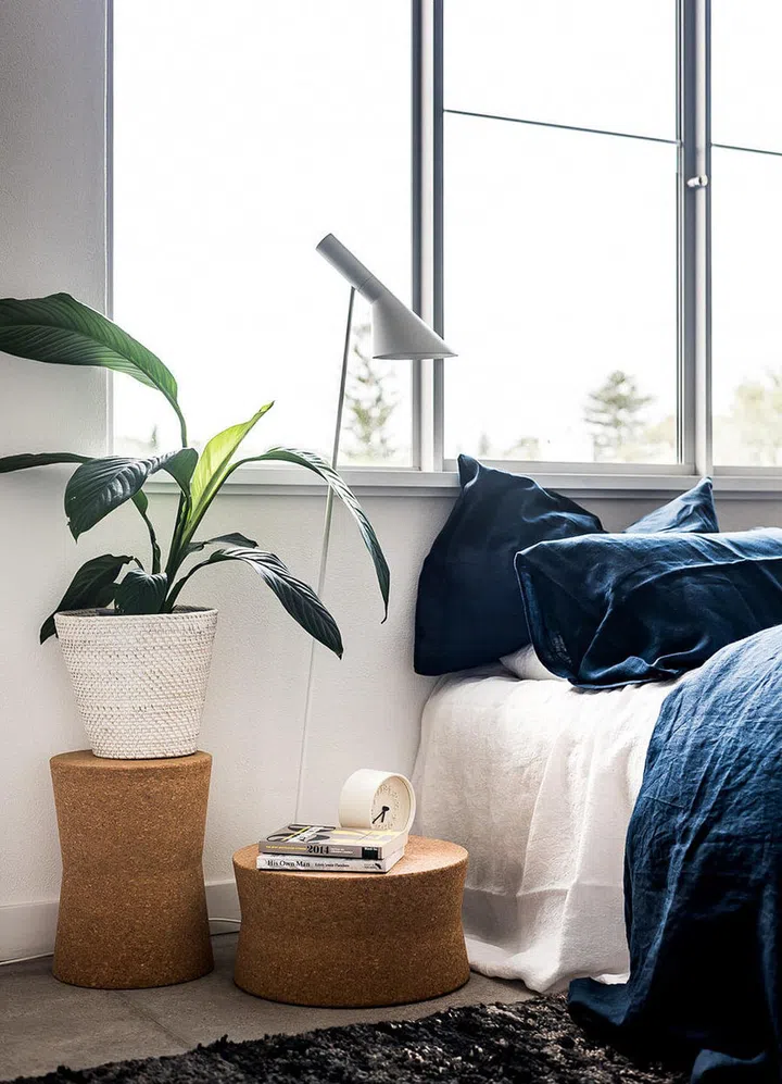 Natural materials like cork and linen (and green plants!) help imbue a relaxed atmosphere. Side tables in different sizes also create some visual interest in the space.