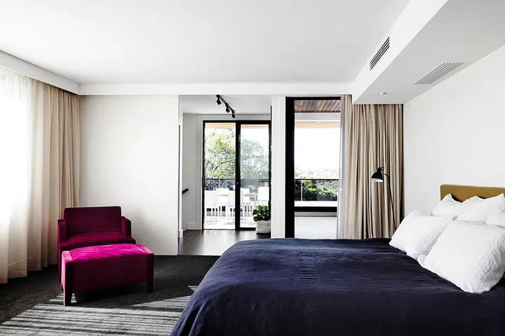 Printed area rugs in the bedroom add warmth and give it an interesting visual appeal with the mix of colour and patterns.