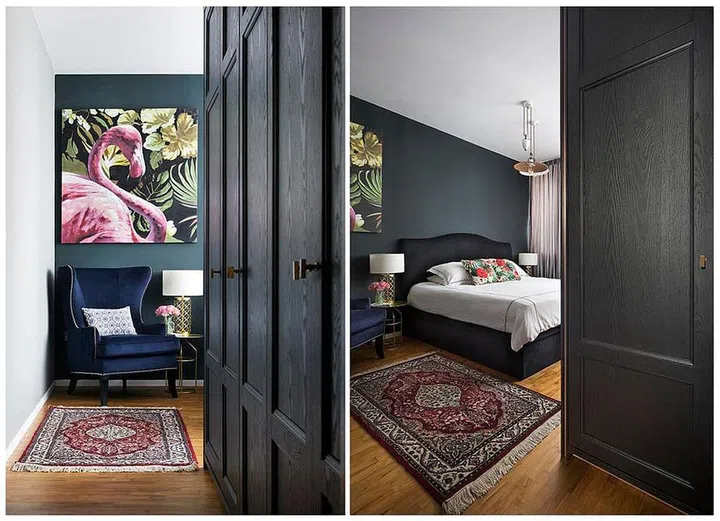 Contrast dark colour palettes with vivid accents, like a patterned rug or vibrant wall art. The combination and placement of the accent chair, wall art and area rug here create a stunning entrance.