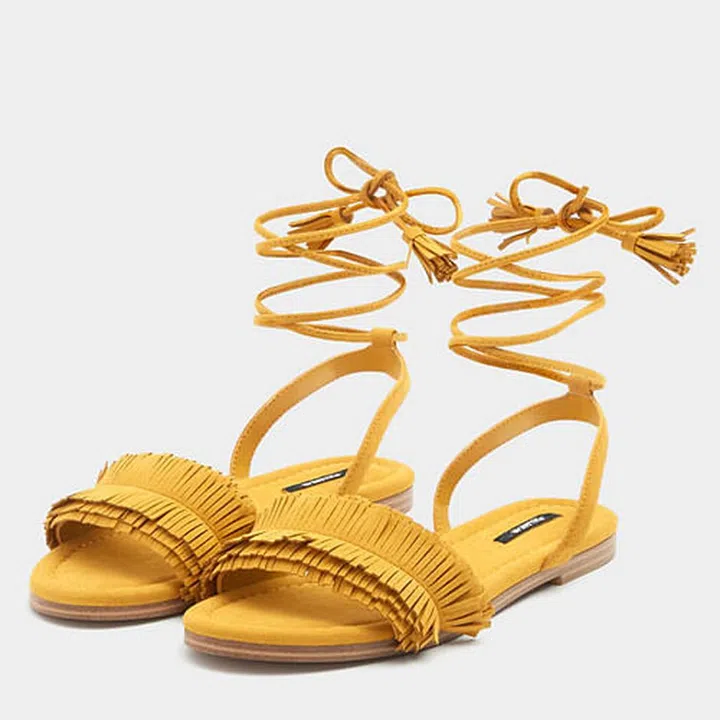 Add a fun pop of colour to your look with these mustard yellow flat sandals with fringe detailing on the strap and laced-up ankle straps with tassels. A classic essential to complete an arsenal of summer-ready outfits, this fun and spirited pair of sandals will surely turn heads your way.