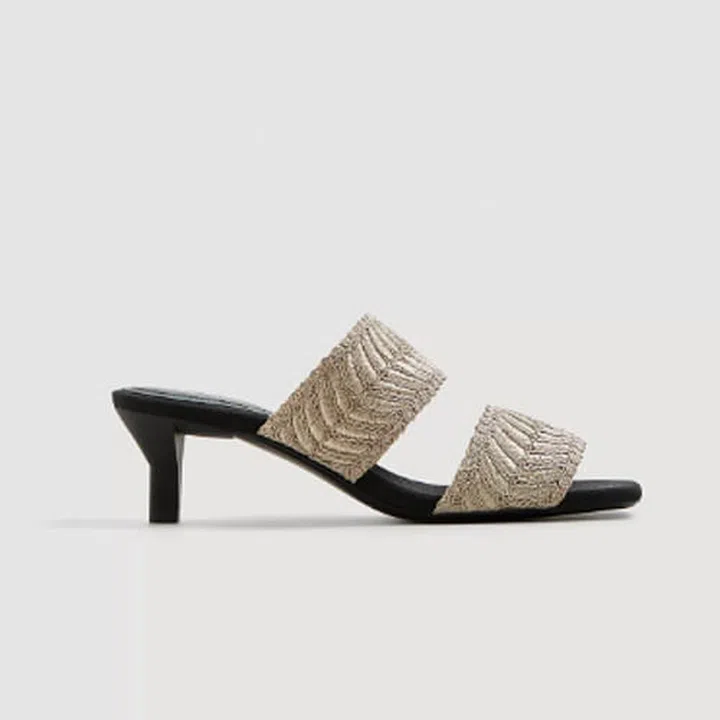 Featuring straps with a decorative textured finish, these sandals meld sophistication and rawness into one with sleek black kitten heels (which were once considered outmoded, but are now making a huge comeback) and juxtaposing beige rattan-like straps. This makes them a great option to slip into for the office, and even for off-duty days.