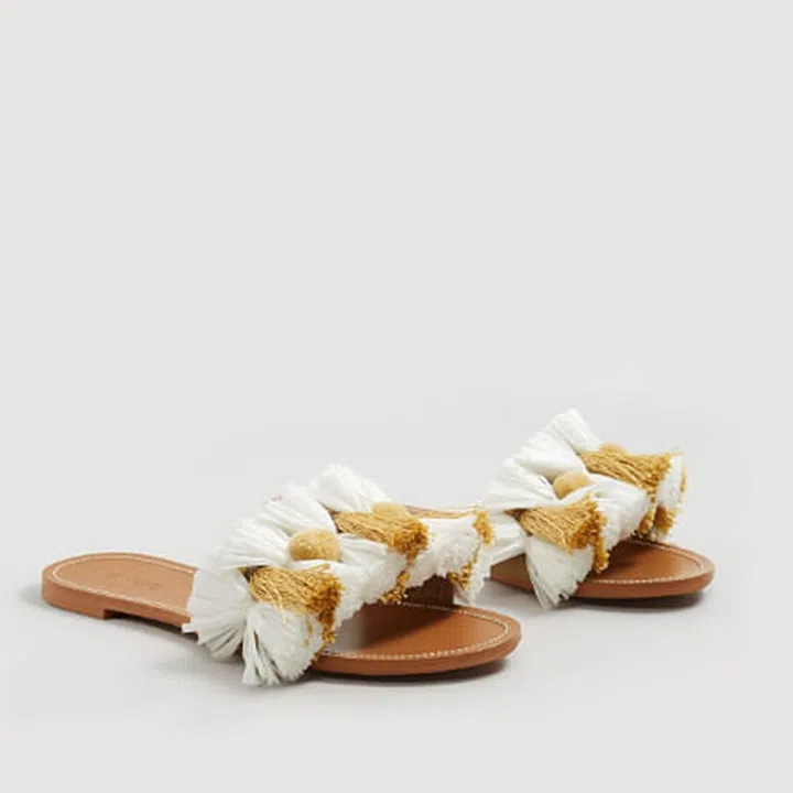 Fun up your weekend ensemble with this pair of flat-heeled sandals with a statement decorative tassel design. Featuring mustard yellow and white tassels with matching pom poms, these easy slip-ons will add a touch of whimsicality to your everyday look. Team this with a printed playsuit or a simple white button-up dress and you’re all set to take on the upbeat and sangfroid “seaside holiday” trend for the season.