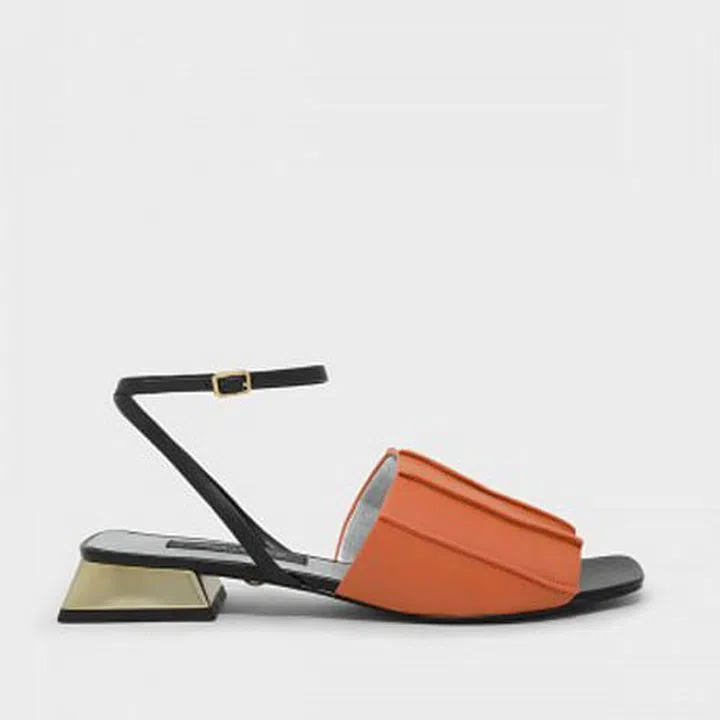 The bright orange (a perfect colour choice for summer, we must say) leather straps on these sandals feature open seams for a textural effect. Complemented by a sculptural low flare block heel in gold for an elegant touch, these sandals look polished and sophisticated for the office.