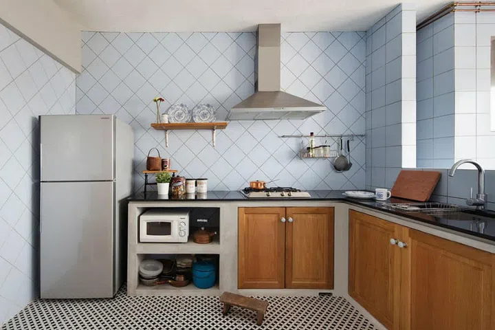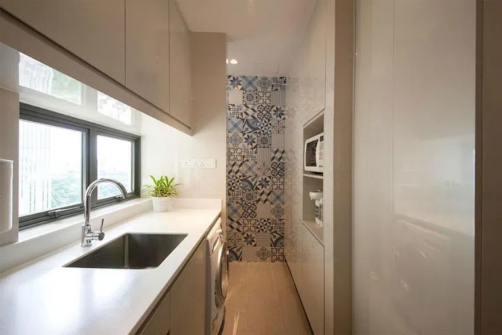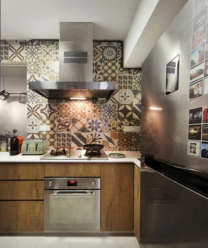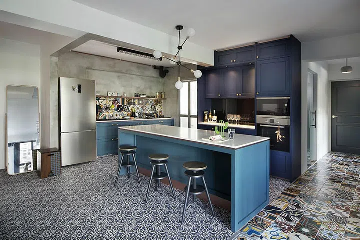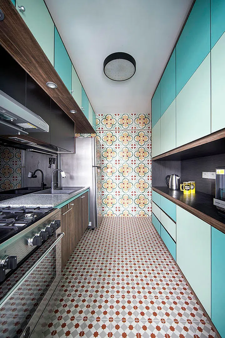 The homeowners in this open-concept HDB home chose mismatched tiles for the kitchen, with four different patterns in one area. The muted tones of the appliances and cabinets keep things looking balanced.