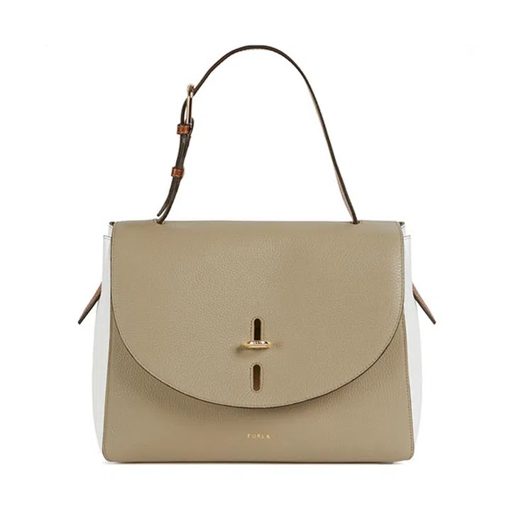 Who said that a rotating buckle has to be fully metal? Furla took advantage of their leather craftsmanship to create an ingenious leather opening for this bag.