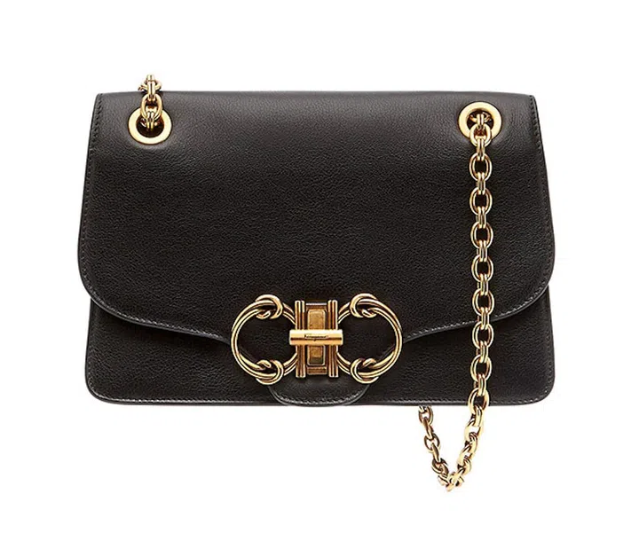The Gancini Flap bag can be carried as both a handbag or crossbody bag, and has a front flap design. The focal point of the bag is the golden double thread nautical knot clasp that has a retro vibe. Parts of the bag are made with recycled PET.