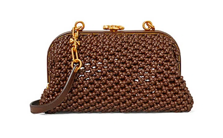 This vintage-inspired handbag is made with woven leather in a macramé pattern, and matched with a geometric chain strap. It also features Tory Burch's Double T clasp - even though it doesn't function like a twist clasp, we like this design so much that we decided to include it here.