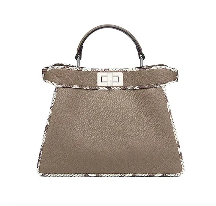 This Fendi bag is made with grey full-grain leather that is trimmed with a python pattern. The bag is further accented with clean and simple palladium-finish hardware as well as a Fendi-engraved rectangular buckle.