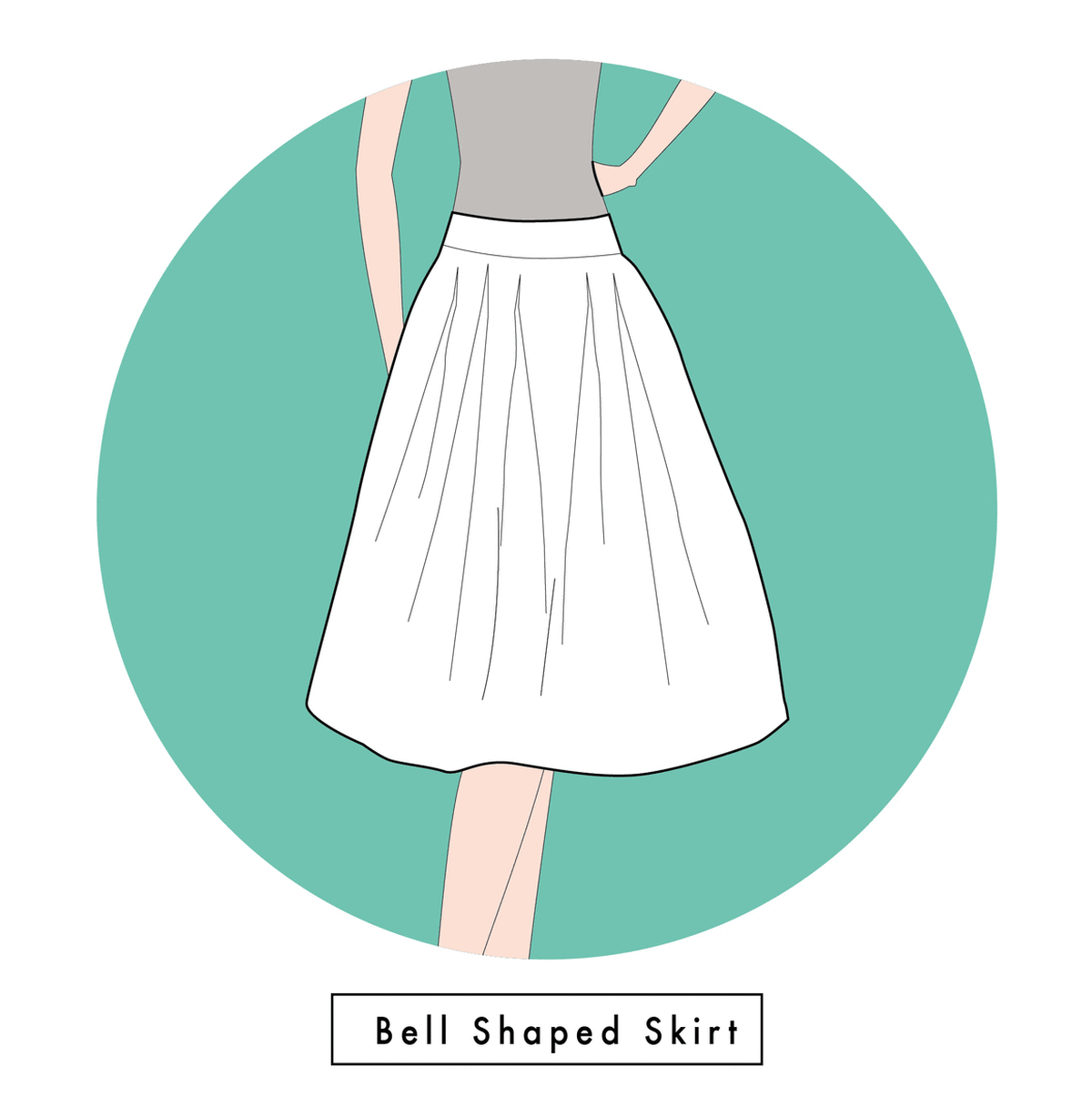 This skirt hugs at the waist, then flares out to then fall straight at the knees. Basically, think of the shape of a bell and you’re there (how pleasant that they’re actually named after something useful and easy to reference!).