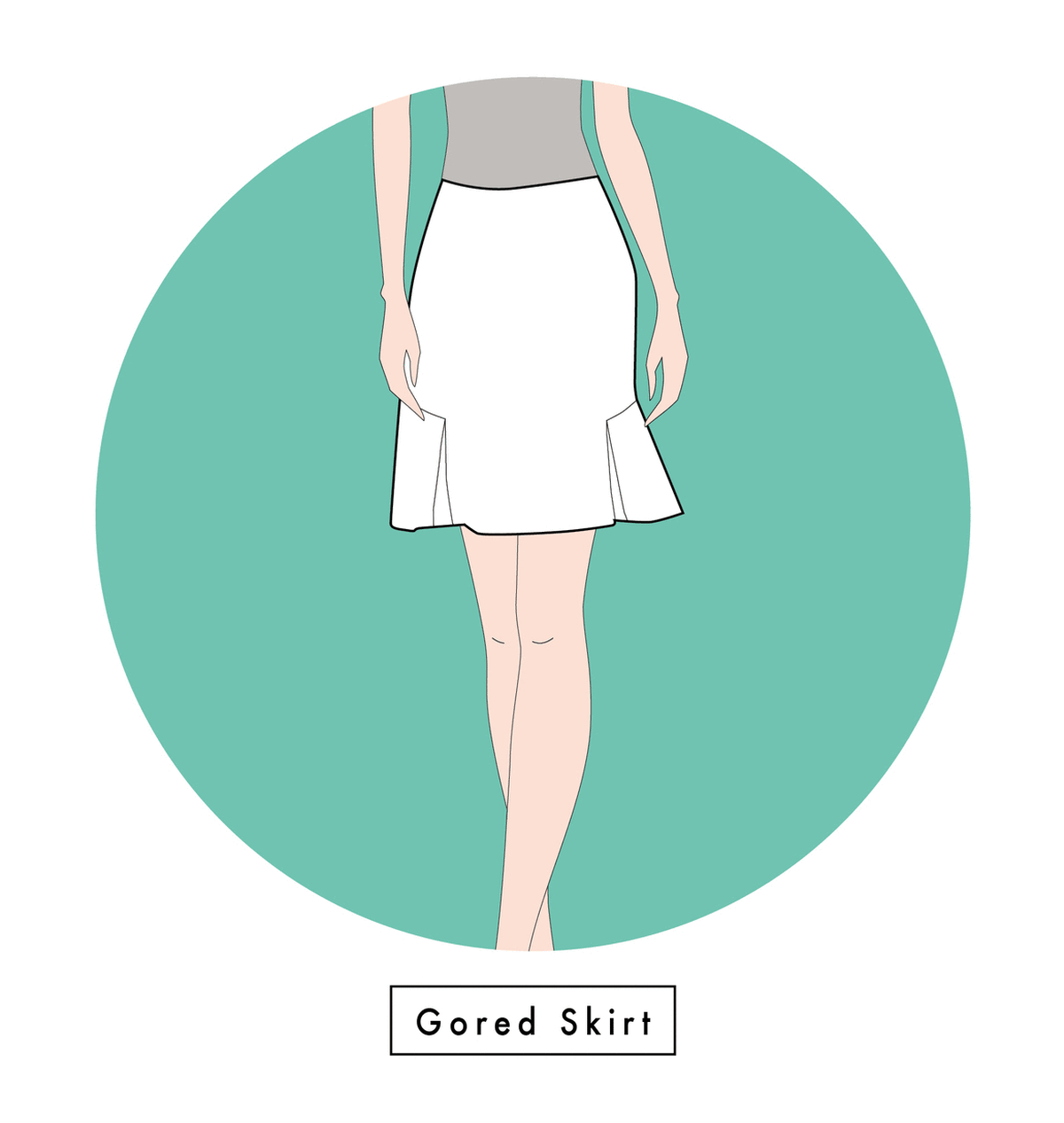 The godet has the triangular pieces fed in from the waistline down, whereas the gored has the pieces stitched in halfway down the skirt to the bottom hemline. That’s it! Simple, but significant difference