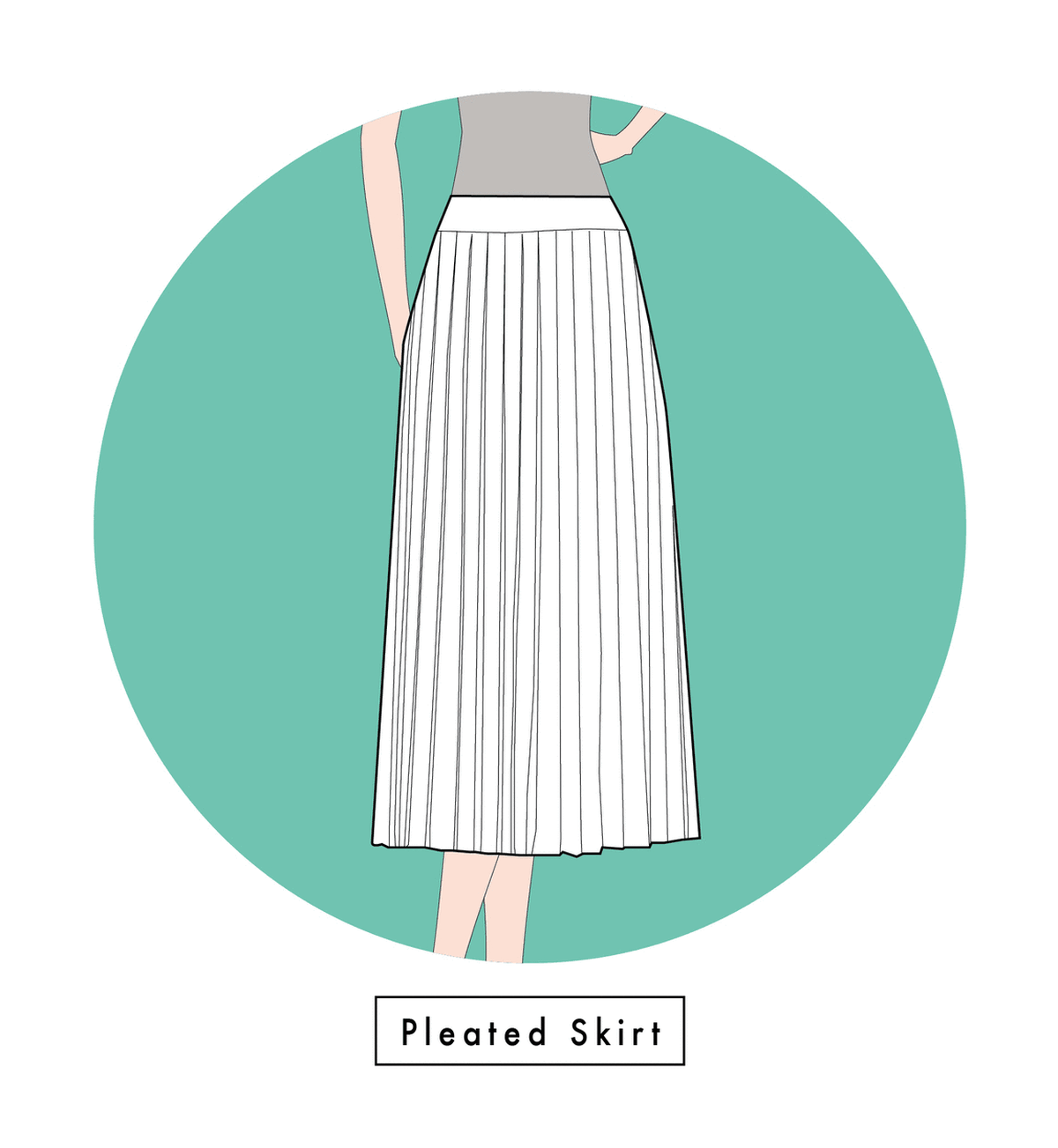 With vertical pleats from waistband to hemline, the pleated skirt can vary in length, colour and thickness.