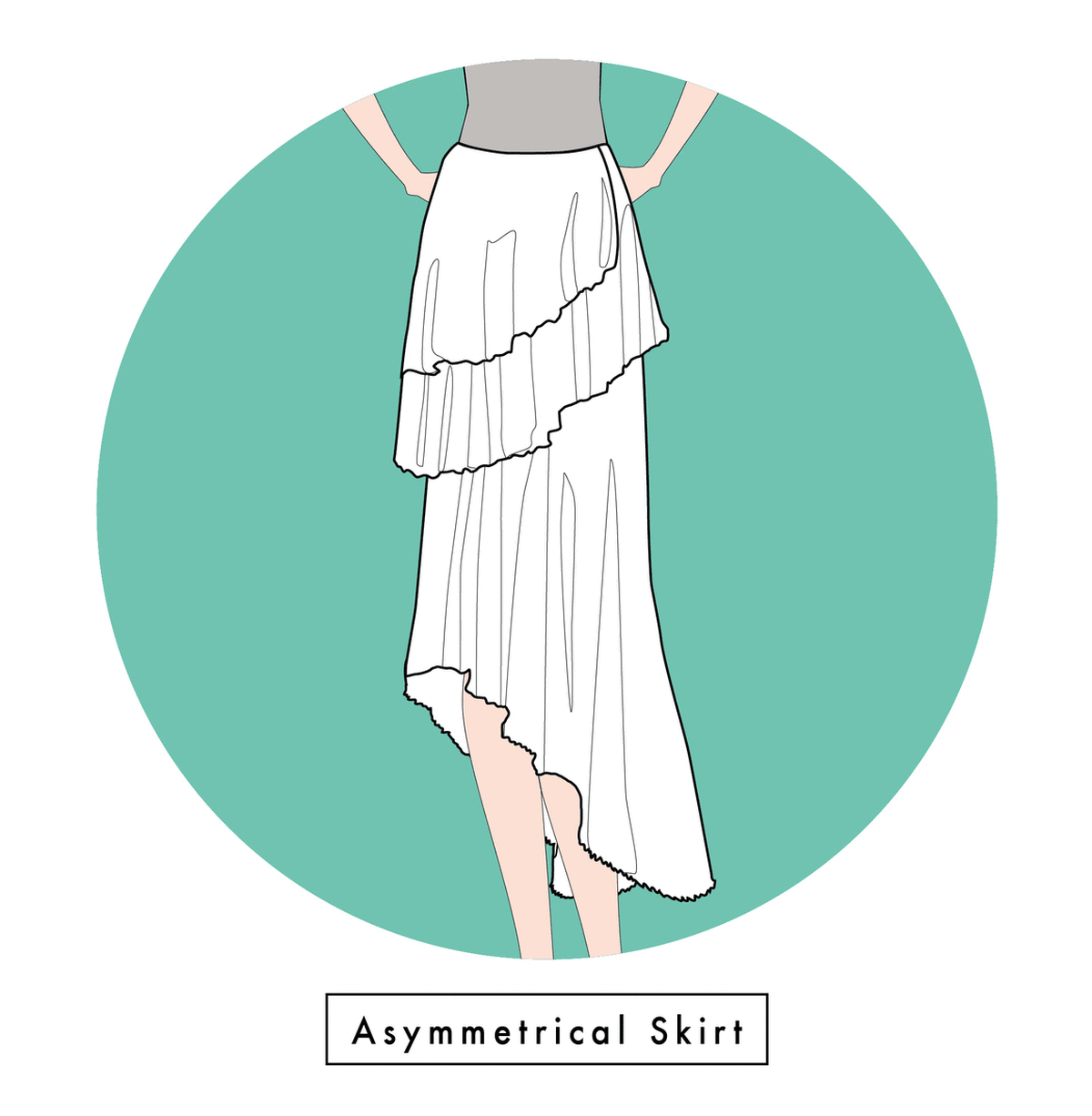 Ohhh another easy one: as long as one side is longer than the other, it’s asymmetrical. Can be just one layer or ruffled layers - doesn’t matter. As long as the hemline isn’t equal on both sides, you’ve got yourself an asymmetrical skirt.