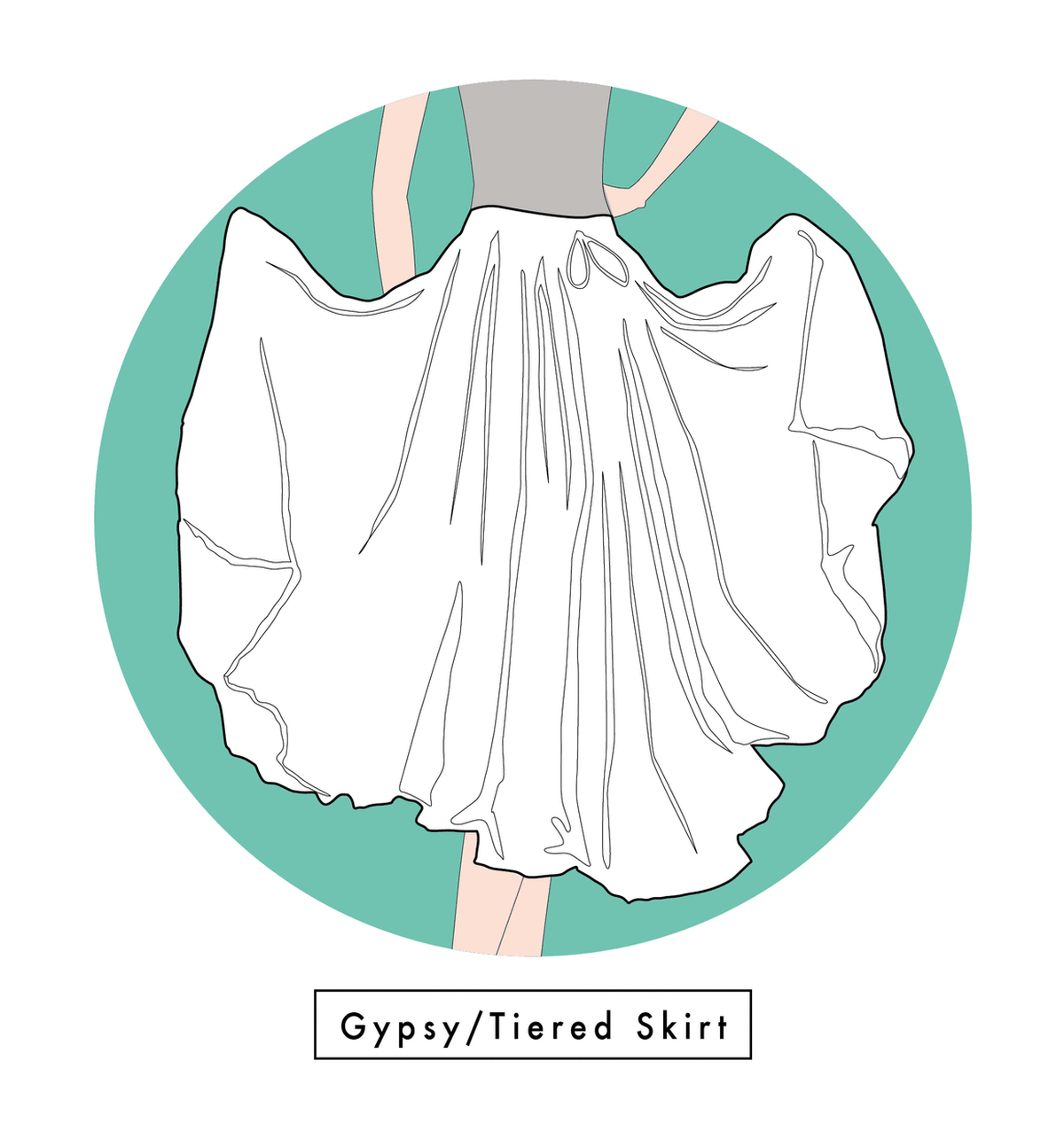 Exactly as the name suggests, this skirt derives from the gypsy lifestyle. Traditionally floor length, these will be ruffled, wrinkled, tiered or all three at once.