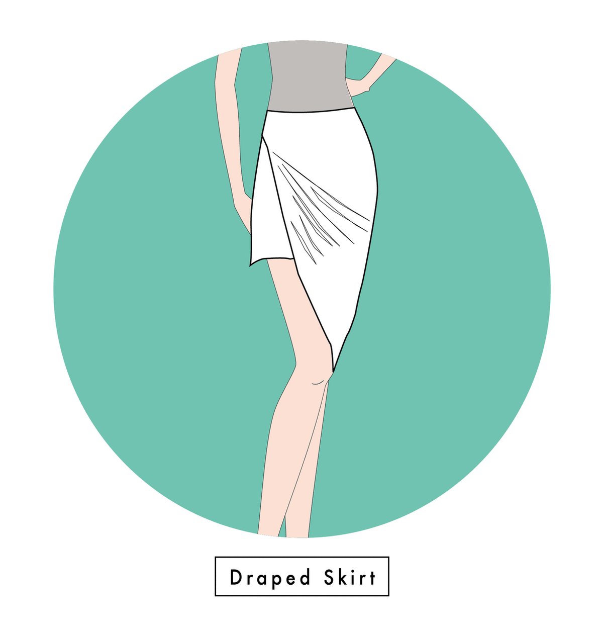 The draped skirt’s main feature is the gathering of fabric at the waist...as if someone has ‘draped’ the material around your waist and fastened it to make a skirt on the spot.