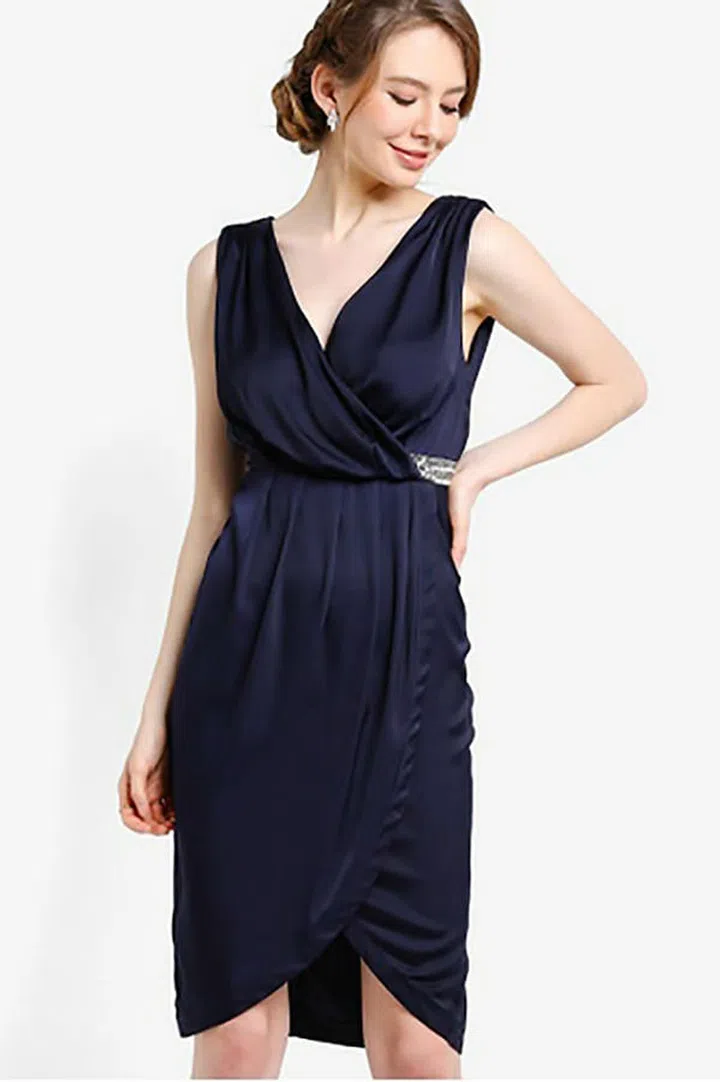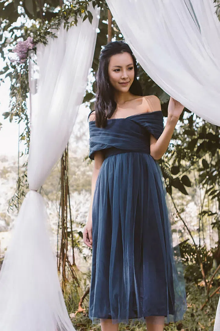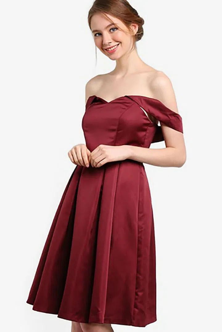 Take the cold shoulder trend tto your besties's big day with this wine red frock. The dress comes in a satin finish and is also available in navy blue for those who prefer cooler tones.