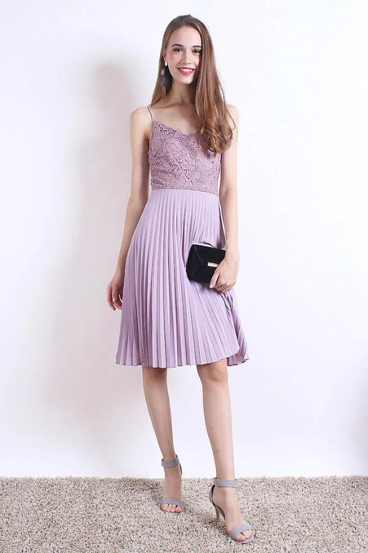 Up your pleated skirt game with the crochet lace panelling of this midi dress! The soft lilac shade works wonder with long waves and a classic red or plum lip.