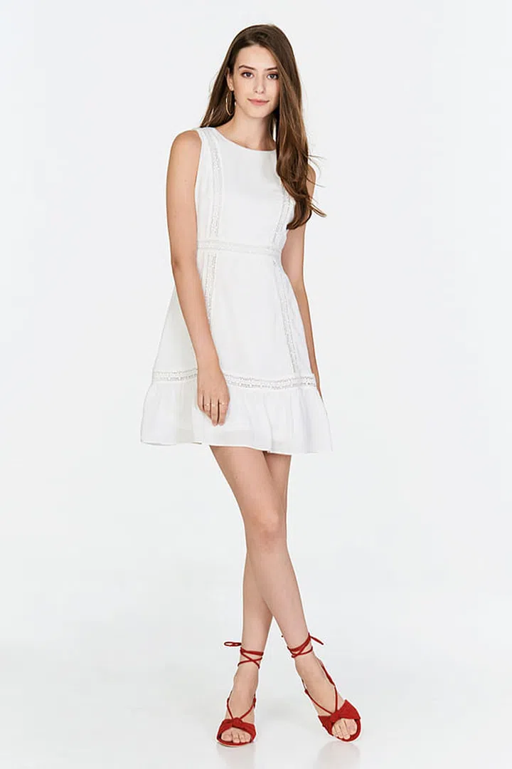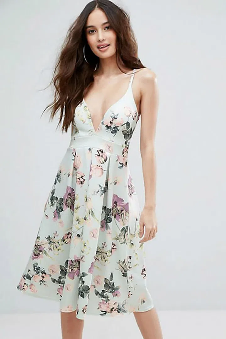 Want to wear white but need to steer clear of upstaging the bride? Try this midi dress with floral crochet trimmings, some strappy heels and some dainty gold accessories for a youthful yet refined look.
