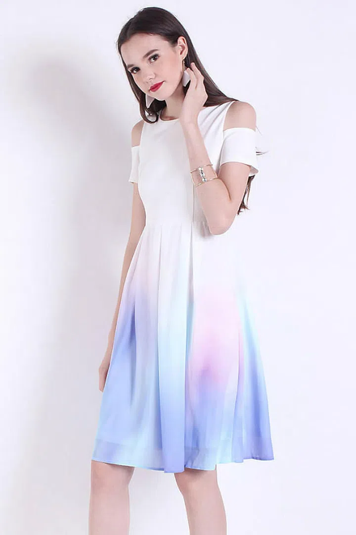Pastel shades blend into a simple white base to create a watercolour-like print for a semi-casual outfit that's still appropriate for lunch weddings. Just look out for food stains!