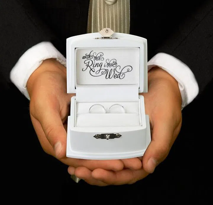 You want something white, classic and elegant to go with a sophisticated celebration? You'll like this one which even opens up to reveal beautifully inscribed words "with this ring I thee wed".