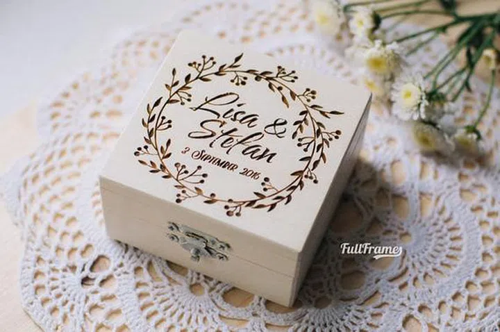 These beautiful wooden boxes can be personalised with an engraving both on the lid of the box as well as a secret message on the underside of it. You'll also be able to choose the colour of the wood, as well as what goes in it (a pillow, burlap rolls or moss).