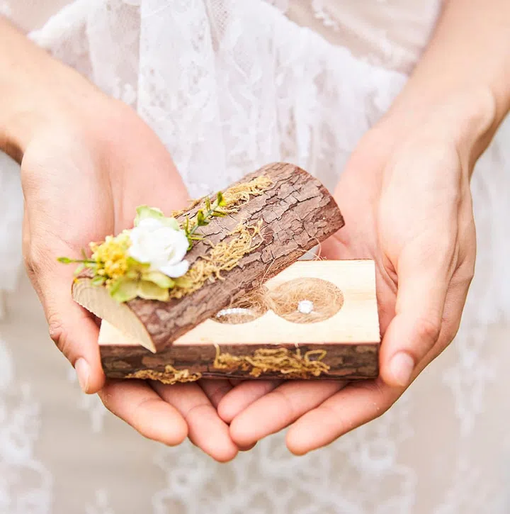 Little details make an impact! Exchange your "I dos" with your rings presented in this wooden holder that'll look right in place at a forest, rustic or garden-themed celebration.