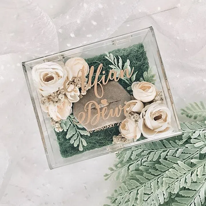 These romantic acrylic wedding boxes come adorned with silk flowers and a ring holder, and be personalised with your name, wedding date or other engraved words.