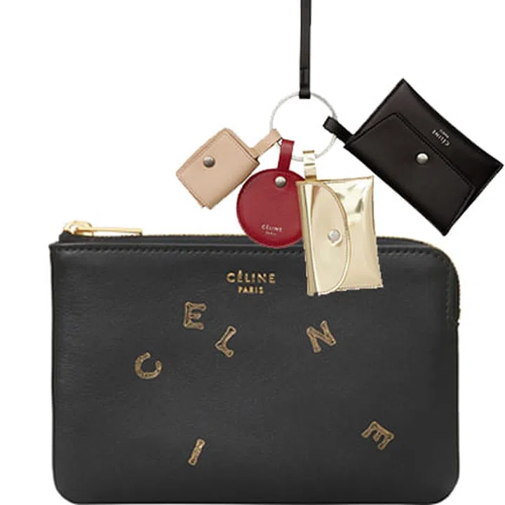 Comprising seven small leather good styles from card holders to coin purses in black and light gold, the Céline Christmas Capsule Collection features the a stamp animation developed from the Alphabet jewellery. With mini multi-purse key rings and gilded alphabet stamps acting as an accent on the accessories, these exquisite leather trinkets are not only beautiful, but practical too.