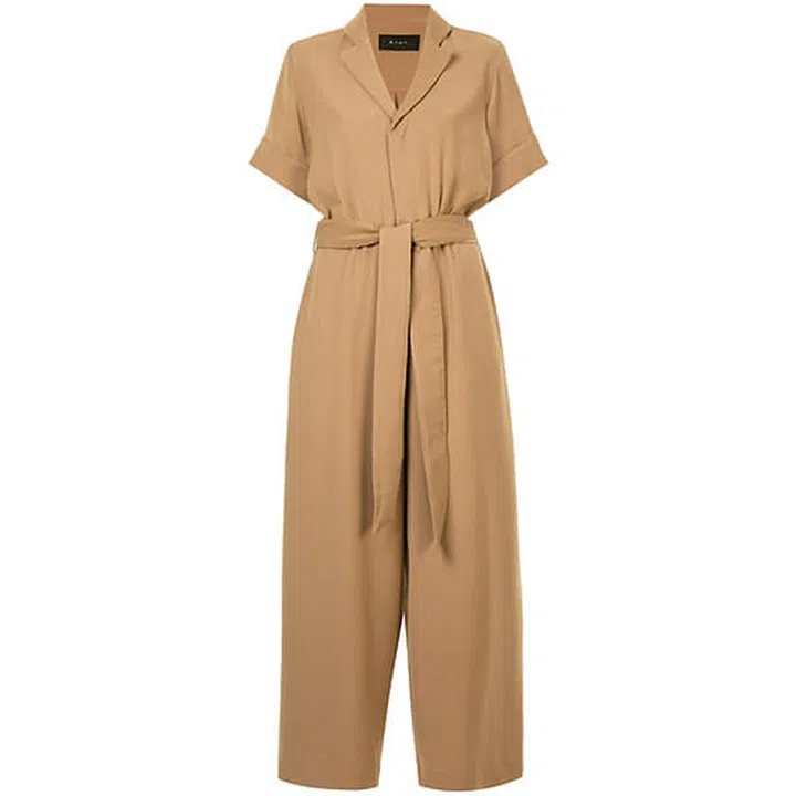 For a relaxed vibe, opt for this camel-hued belted jumpsuit with a chic notched collar. Featuring short sleeves and a straight leg, this number is the epitome of “casual chic” and will look sophisticated in the workplace.