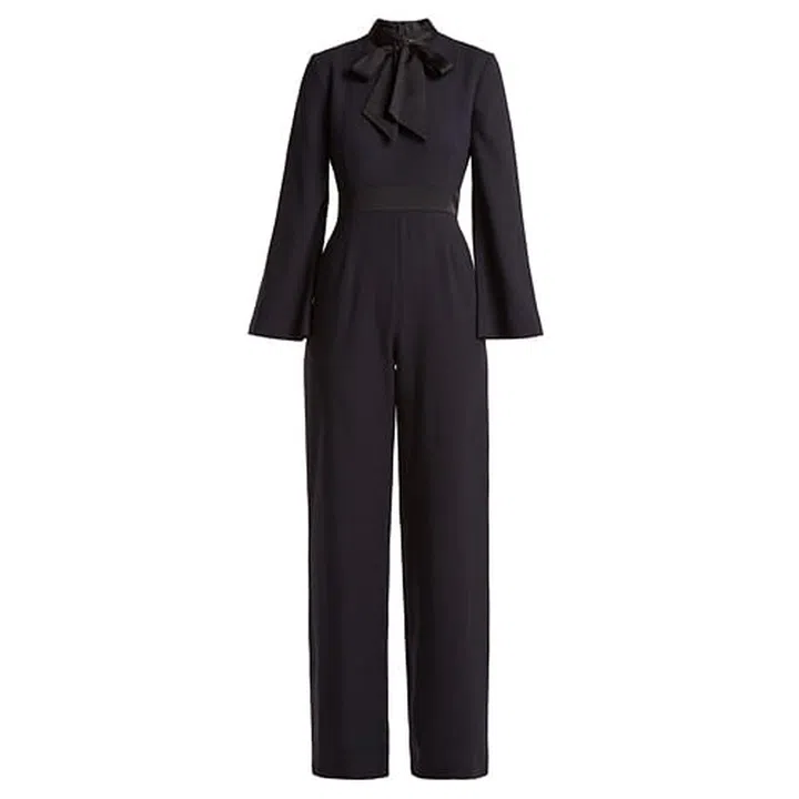 This long sleeved navy jumpsuit is charged with high levels of sophistication and style. Cut to an elongated wide-leg silhouette and finished a pussybow detail at the raised collar, this polished must-have can even be worn for important events and occasions given its simplicity and elegance.