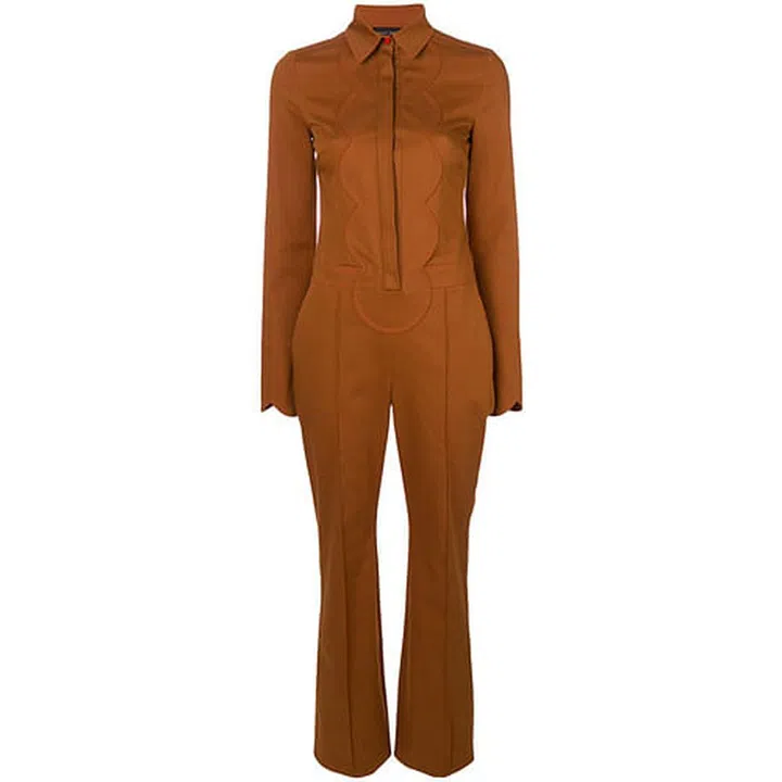 This brown cotton blend embellished jumpsuit from Talbot Runhof features a classic collar, front button fastening, fitted, long sleeves, and slim tailored pants. For a retro look with a contemporary twist, leave the top buttons undone and team this with a pair of strappy high heels.
