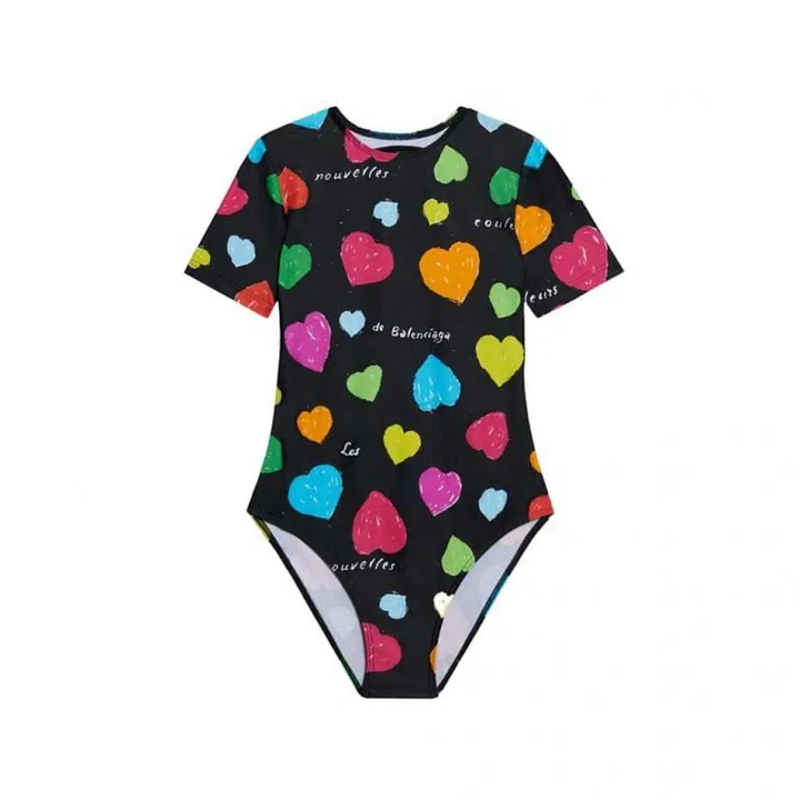 Digging into the archives, Demna Gvasalia turns up this playful one-piece design which features multi-coloured heart motifs and a flirty open-back detail.
