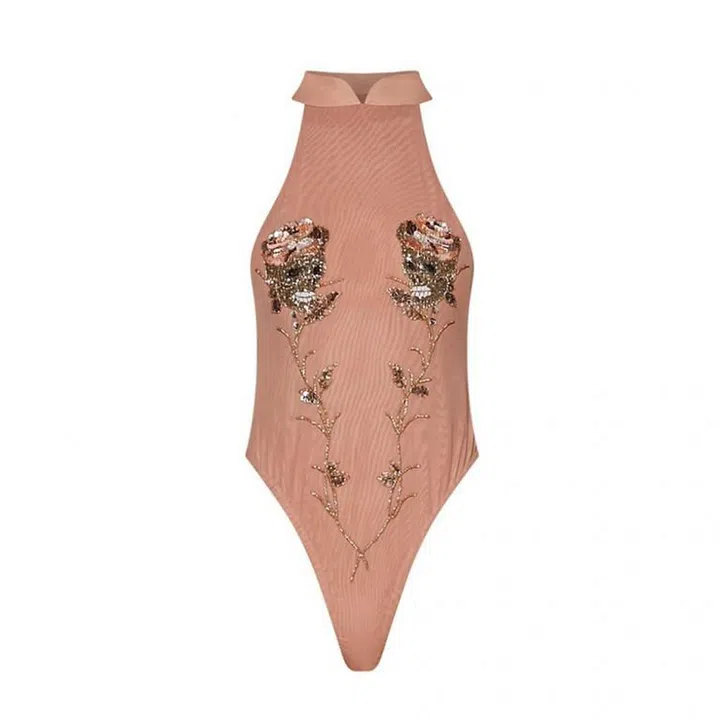 Turn heads with this glam one-piece from the homegrown label which features embroidered sequin skulls and roses.